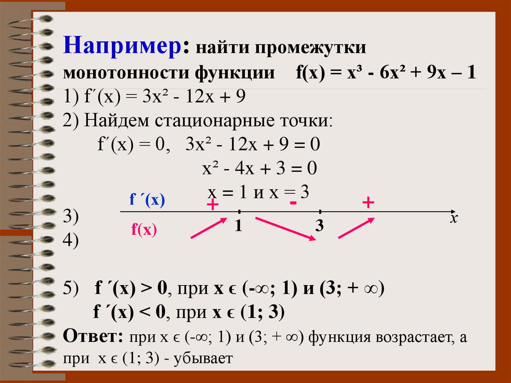 Например: найти промежуткимонотонности функции f(x) = x³ - 6x² + 9x – 1