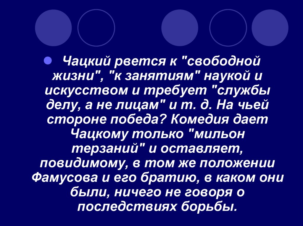 Чацкий рвется к "свободнойжизни", "к занятиям" наукой и
