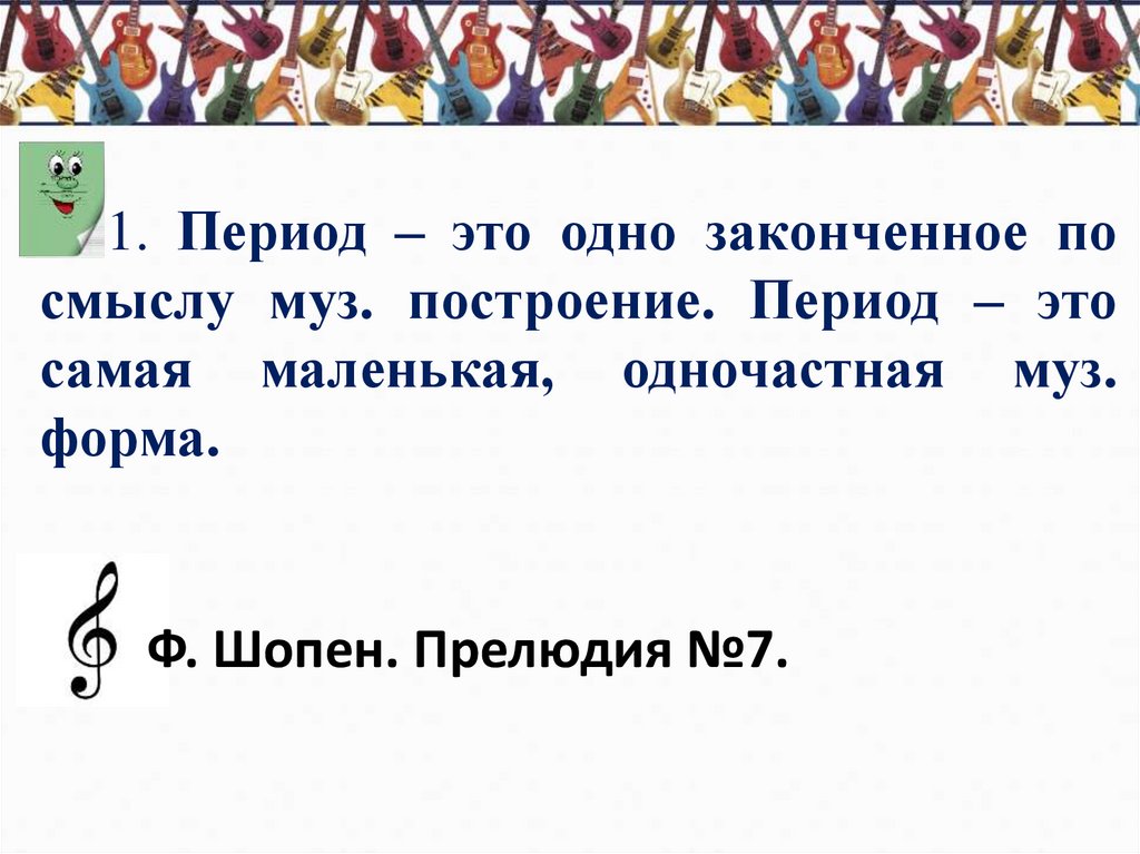 1. Период – это одно законченное посмыслу муз. построение. Период – это