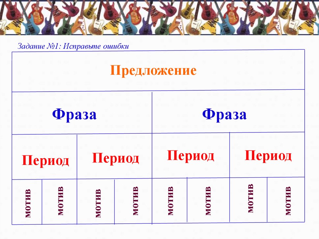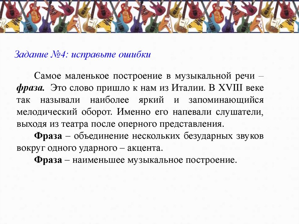 Задание №4: исправьте ошибкиСамое маленькое построение в музыкальной речи –