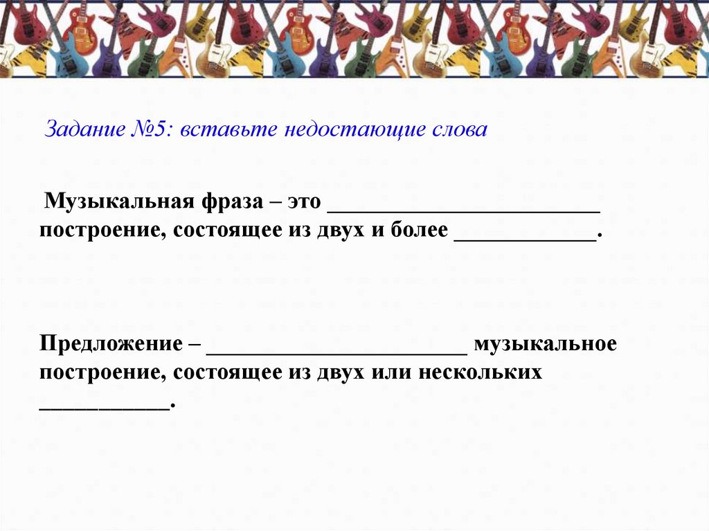 Задание №5: вставьте недостающие словаМузыкальная фраза – это _______________________