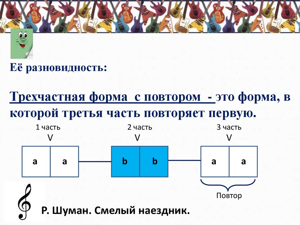 Её разновидность:Трехчастная форма c повтором - это форма, в