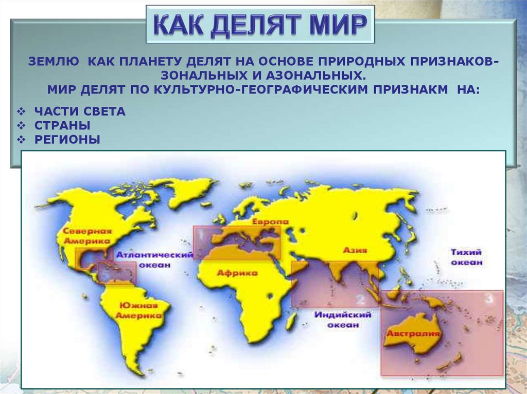 ЗЕМЛЮ КАК ПЛАНЕТУ ДЕЛЯТ НА ОСНОВЕ ПРИРОДНЫХ ПРИЗНАКОВЗОНАЛЬНЫХ И АЗОНАЛЬНЫХ.МИР ДЕЛЯТ ПО КУЛЬТУРНО-ГЕОГРАФИЧЕСКИМ ПРИЗНАКМ НА: