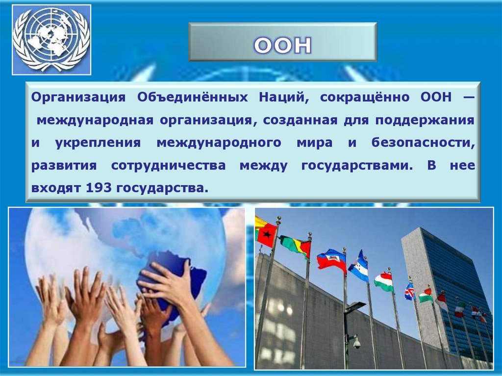 Организация Объединённых Наций, сокращённо ООН —международная организация, созданная для поддержания