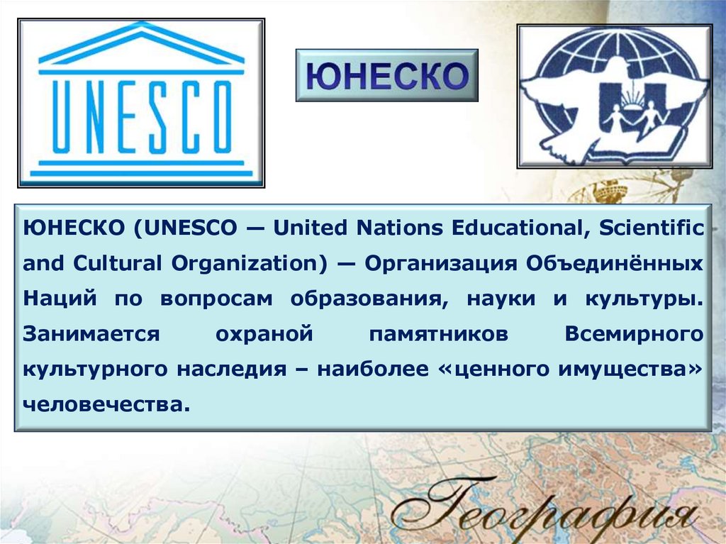 ЮНЕСКО (UNESCO — United Nations Educational, Scientificand Cultural Organization) — Организация Объединённых