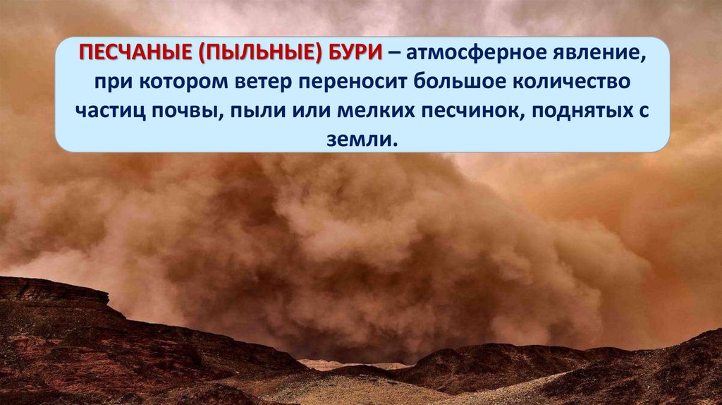 ПЕСЧАНЫЕ (ПЫЛЬНЫЕ) БУРИ – атмосферное явление,при котором ветер переносит большое количество