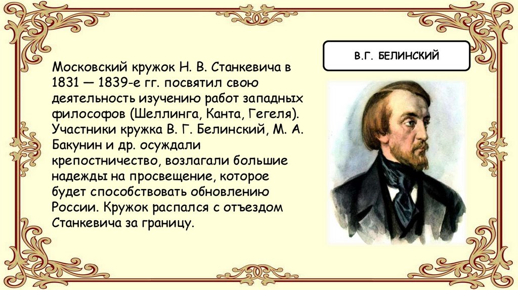 Московский кружок Н. В. Станкевича в1831 — 1839-е гг. посвятил свою