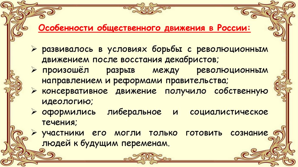 Особенности общественного движения в России:развивалось в условиях борьбы с революционным