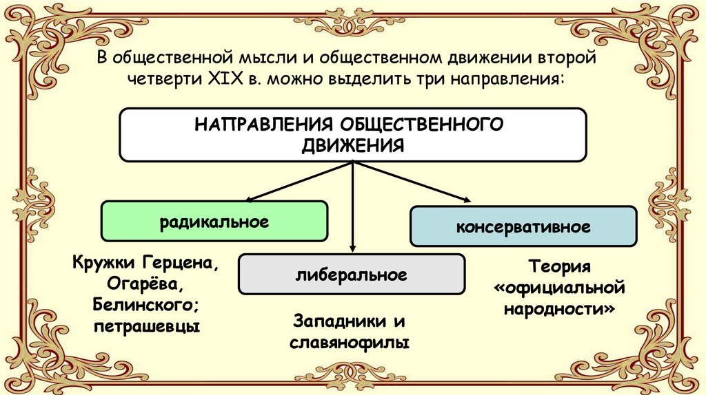 В общественной мысли и общественном движении второйчетверти XIX в. можно выделить три направления: