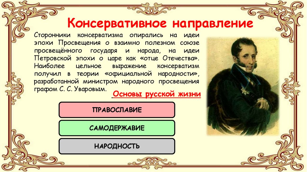 Консервативное направлениеСторонники консерватизма опирались на идеи