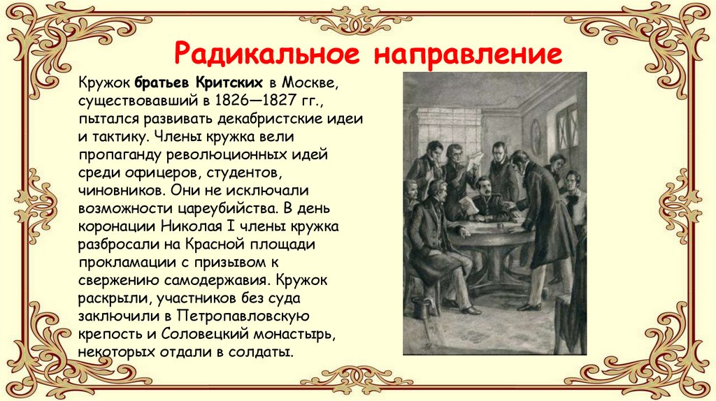 Кружок был раскрыт в 1849 г., организат оров ожидала смерт ная казнь,