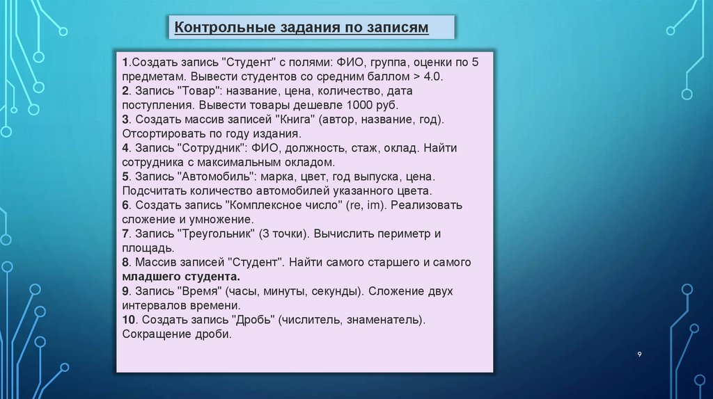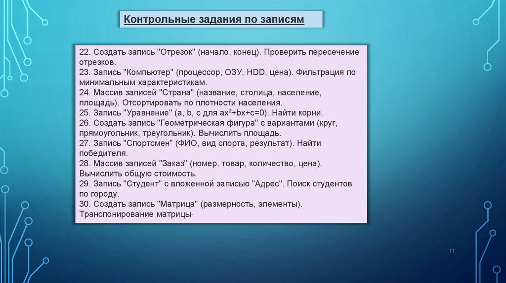 Записи (Record) -Это структура данных, объединяющая фиксированное числоименованных компонентов (полей), которые могут быть разных типов.