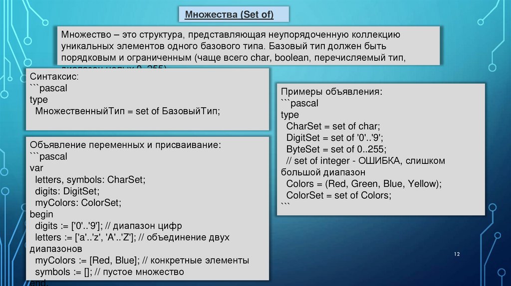 2. Множества (Set of) – для работы с группами неповторяющихся элементов из ограниченного