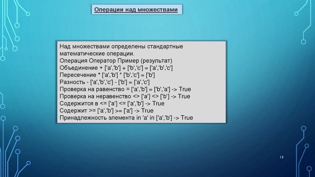 13. Какие операции определены для множеств?