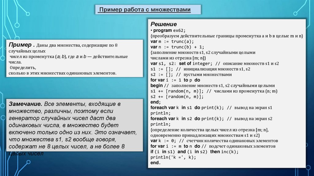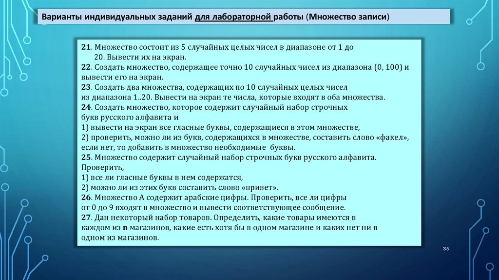 Варианты индивидуальных заданий для лабораторной работы (Множество записи)21. Множество состоит из 5 случайных целых чисел в диапазоне от 1 до