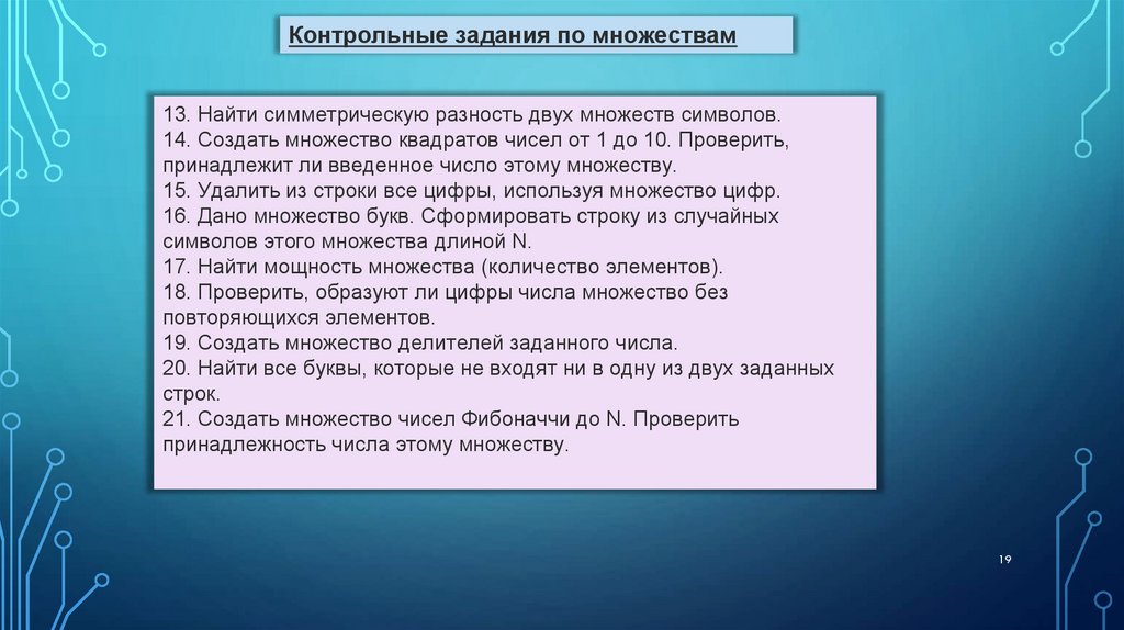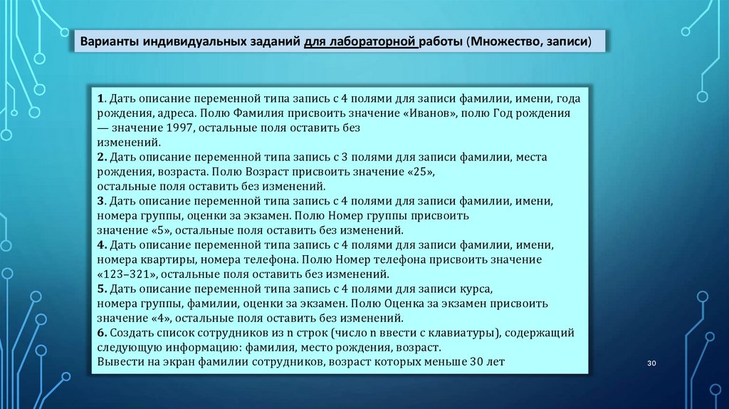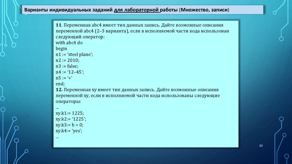 Варианты индивидуальных заданий для лабораторной работы (Множество, записи)28. Множество содержит натуральные числа из некоторого диапазона.