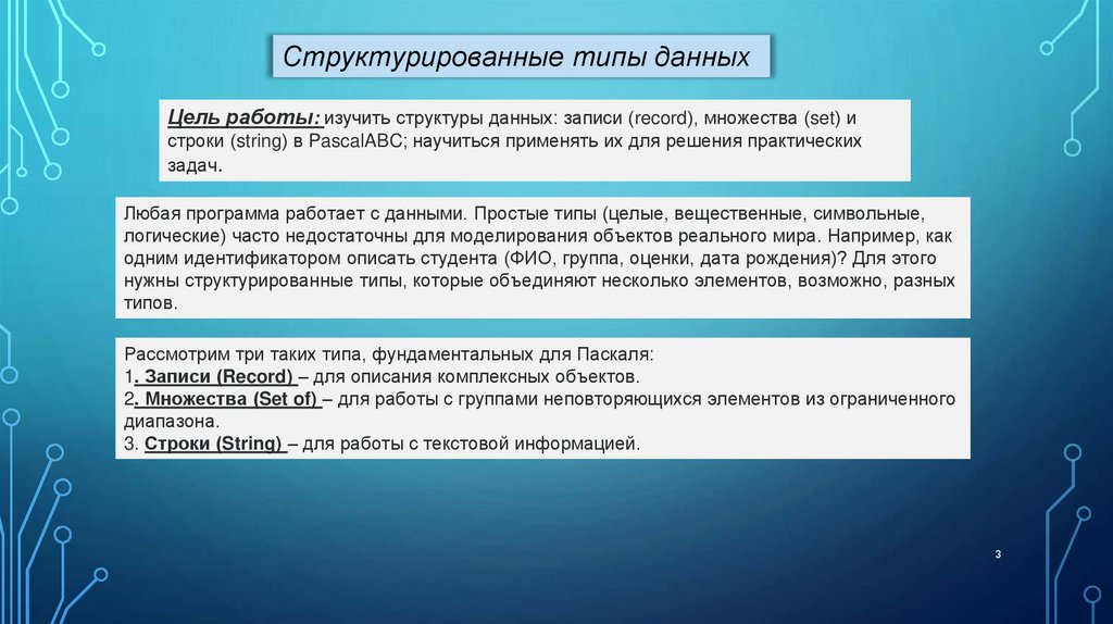 Структурированные типы данныхЦель работы: изучить структуры данных: записи (record), множества (set) и