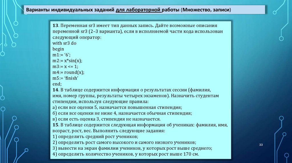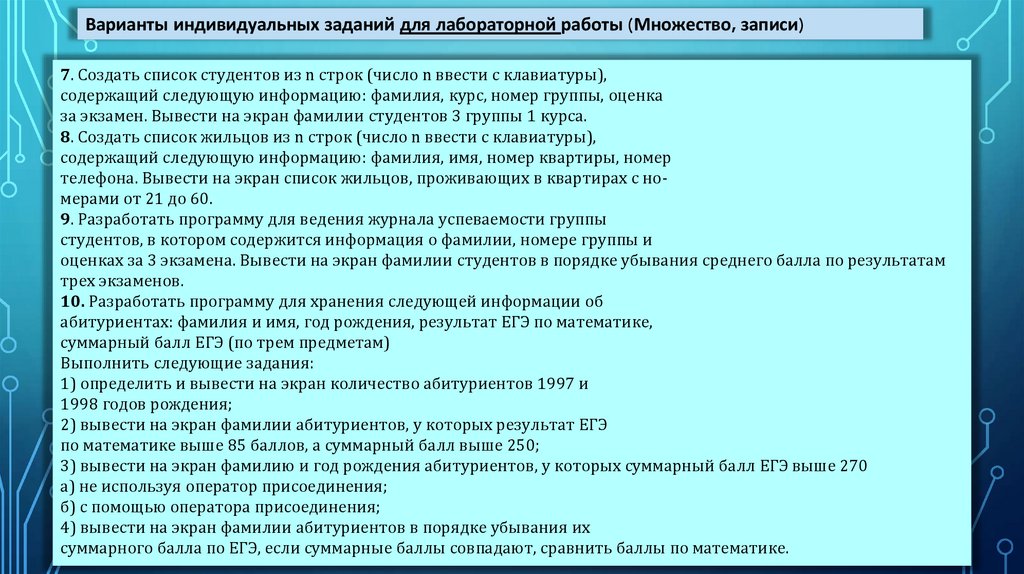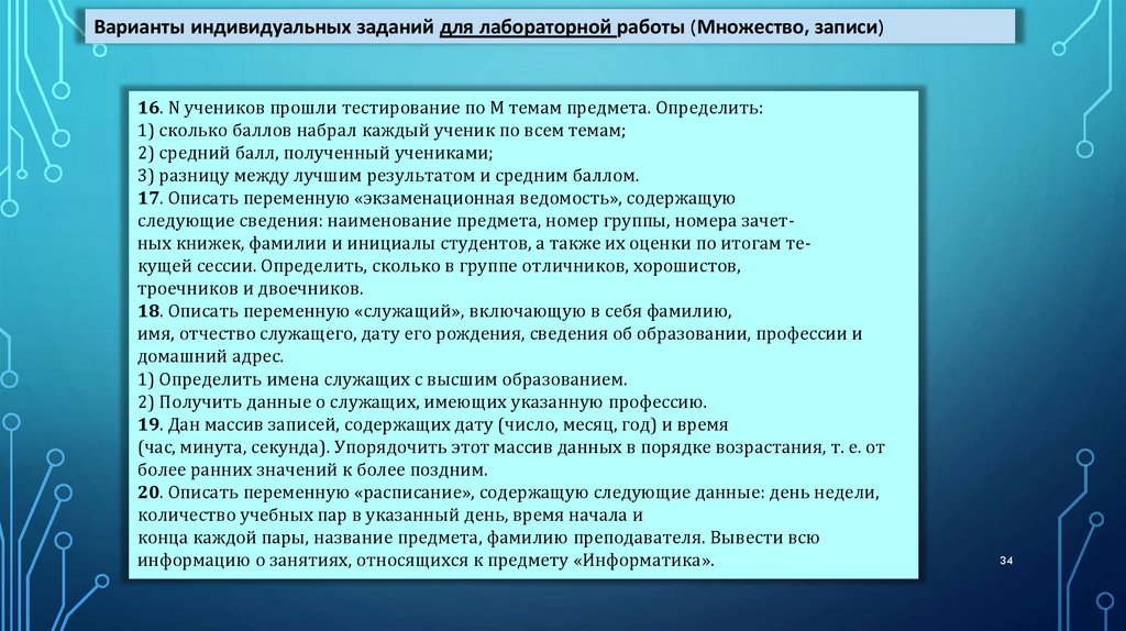 Варианты индивидуальных заданий для лабораторной работы (Множество, записи)16. N учеников прошли тестирование по M темам предмета. Определить: