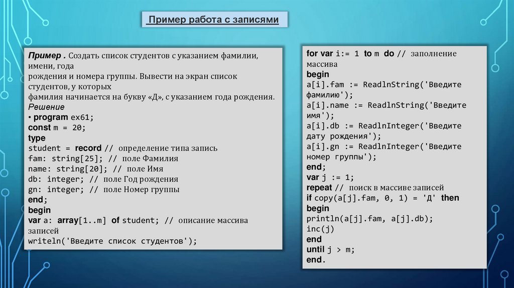 данных. В PascalABC для этого применяется структурный тип данных — запись.