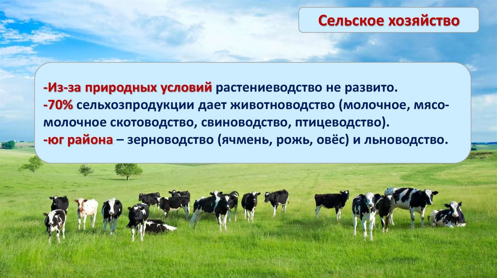 -70% сельхозпродукции дает животноводство (молочное, мясомолочное скотоводство, свиноводство, птицеводство).