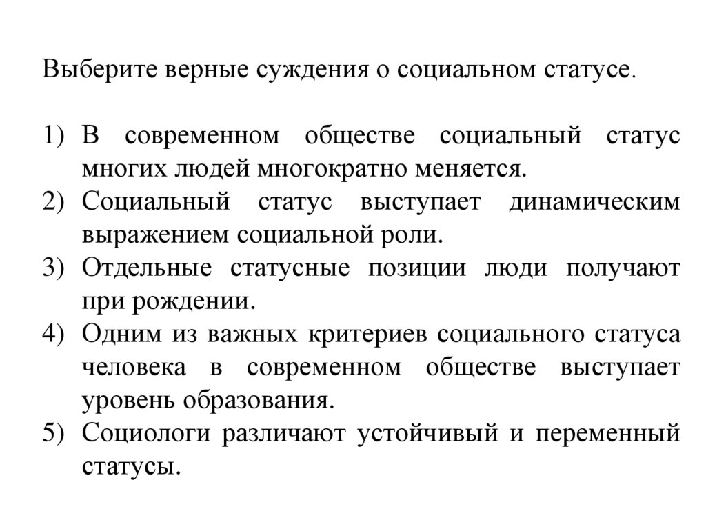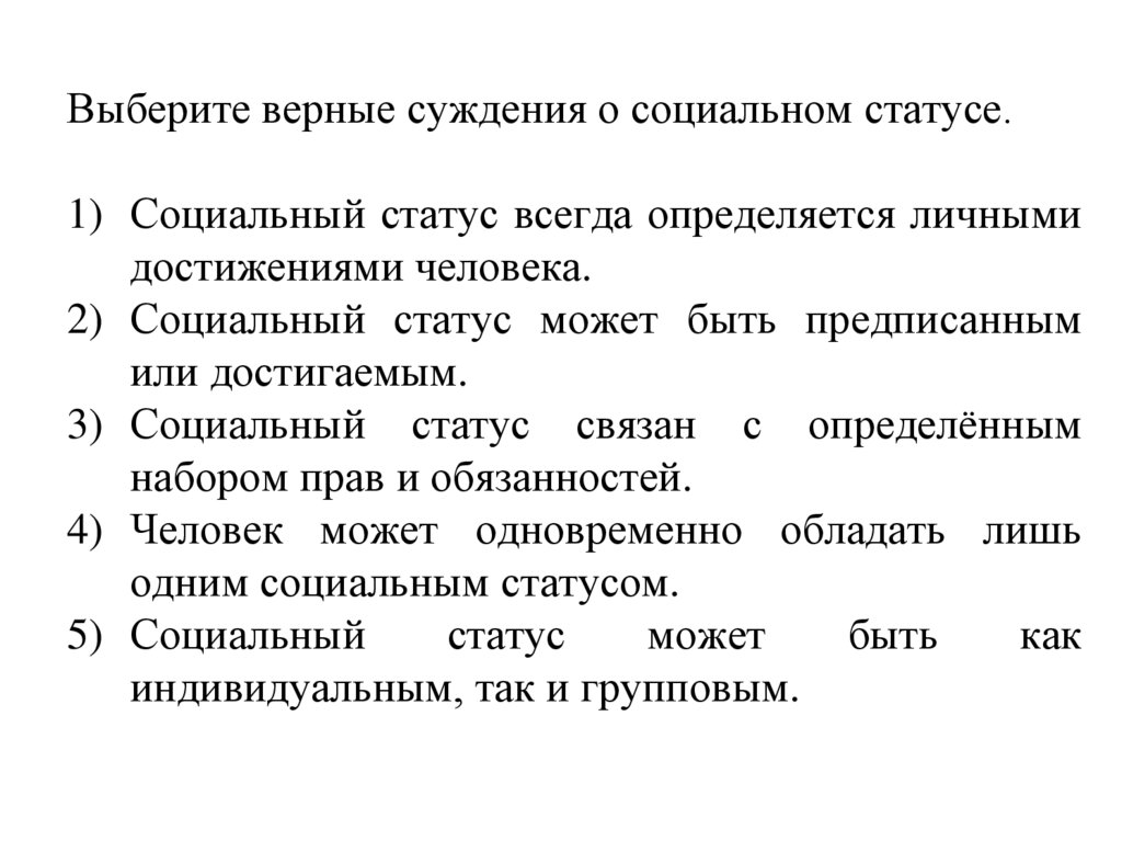 Выберите верные суждения о социальном статусе.1) В современном обществе социальный статус