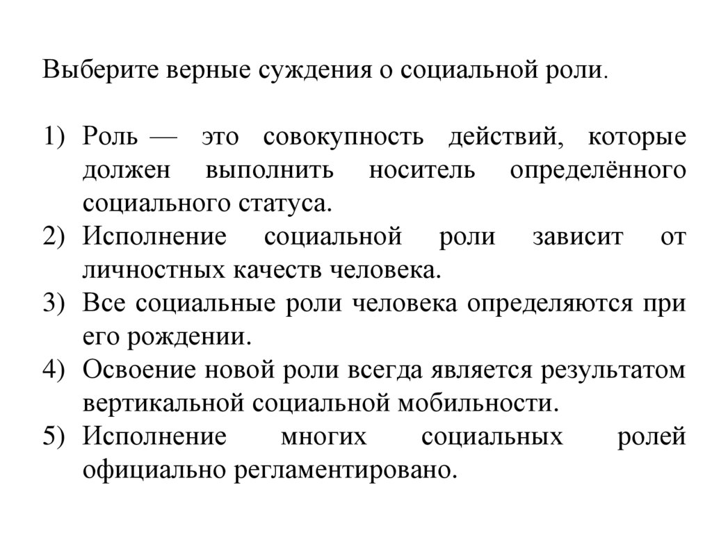 Выберите верные суждения о социальной роли.1) Роль — это совокупность действий, которые