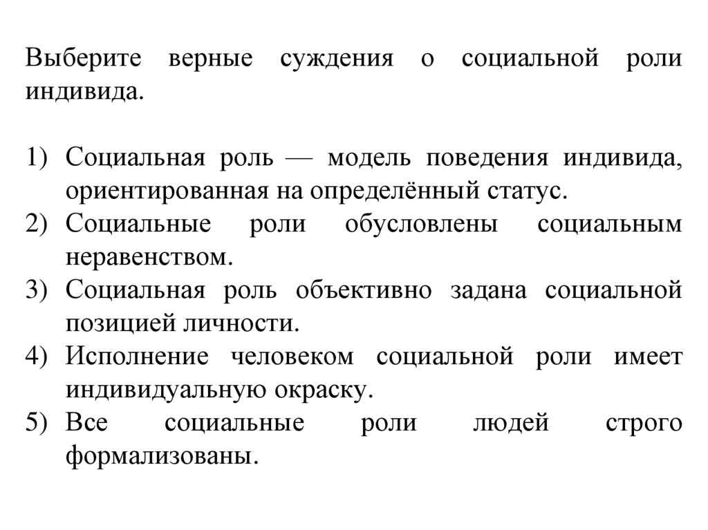 Выберите верные суждения о социальных ролях.1) Социальная