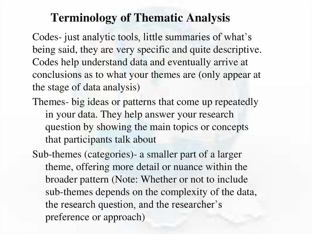 Terminology of Thematic AnalysisCodes- just analytic tools, little summaries of what’s