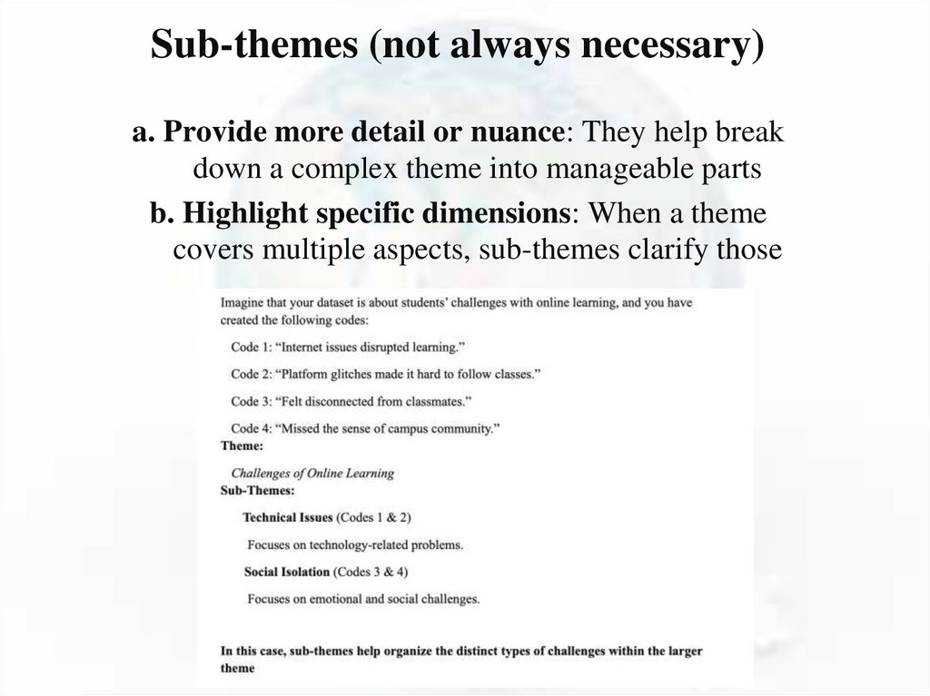 Sub-themes (not always necessary)a. Provide more detail or nuance: They help break