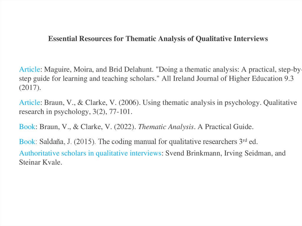 Essential Resources for Thematic Analysis of Qualitative InterviewsArticle: Maguire, Moira, and Brid Delahunt. "Doing a thematic analysis: A practical, step-bystep guide for learning and teaching scholars." All Ireland Journal of Higher Education 9.3