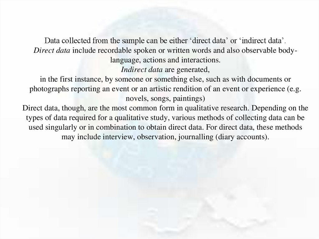 Data collected from the sample can be either ‘direct data’ or ‘indirect data’.Direct data include recordable spoken or written words and also observable bodylanguage, actions and interactions.