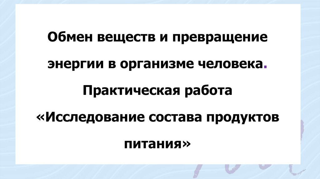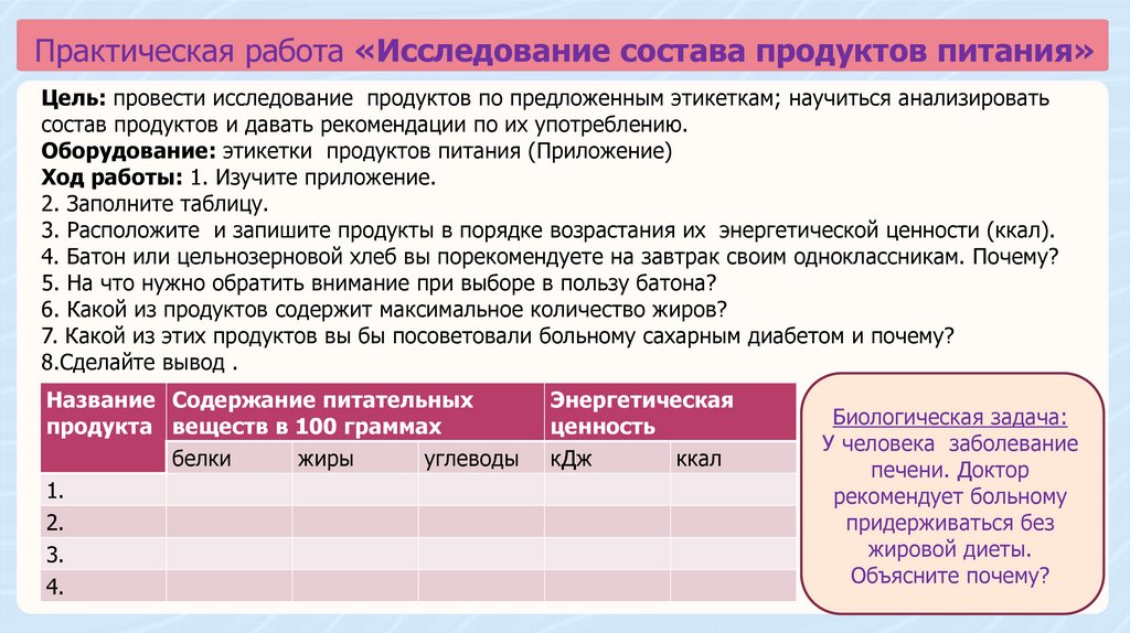 Практическая работа «Исследование состава продуктов питания»Цель: провести исследование продуктов по предложенным этикеткам; научиться анализировать