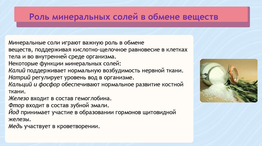 Роль минеральных солей в обмене веществМинеральные соли играют важную роль в обмене