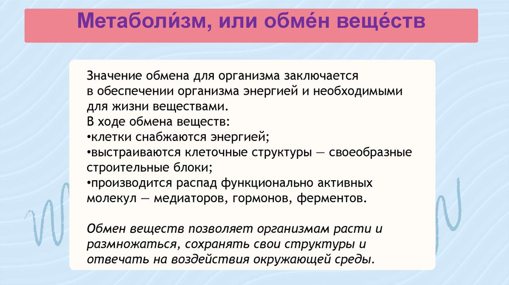 Метаболи́зм, или обме́н веще́ствЗначение обмена для организма заключается
