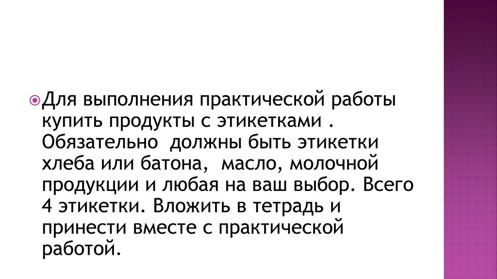 Для выполнения практической работыкупить продукты с этикетками .