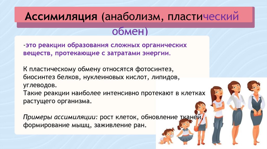 Примеры ассимиляции: рост клеток, обновление тканей,
