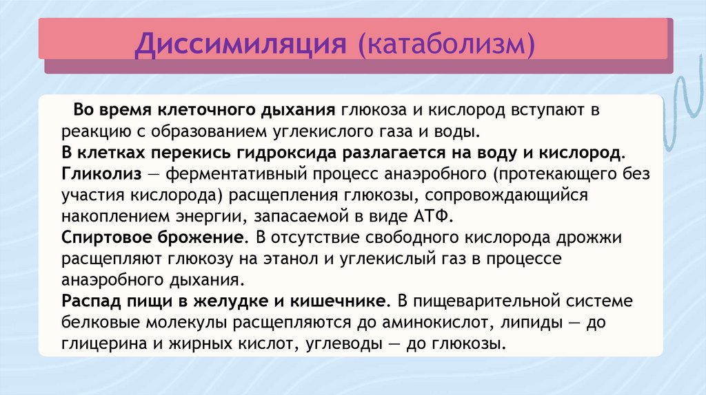 Диссимиляция (катаболизм)Во время клеточного дыхания глюкоза и кислород вступают в
