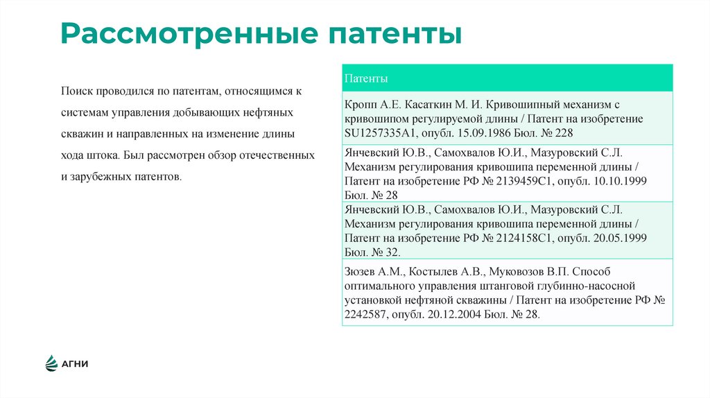 Рассмотренные патентыПоиск проводился по патентам, относящимся к