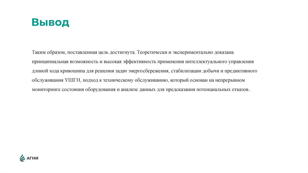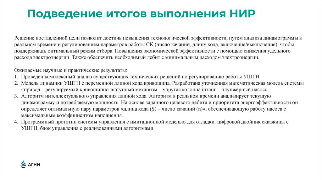 Подведение итогов выполнения НИРРешение поставленной цели позволит достичь повышения технологической эффективности, путем анализа динамограммы в