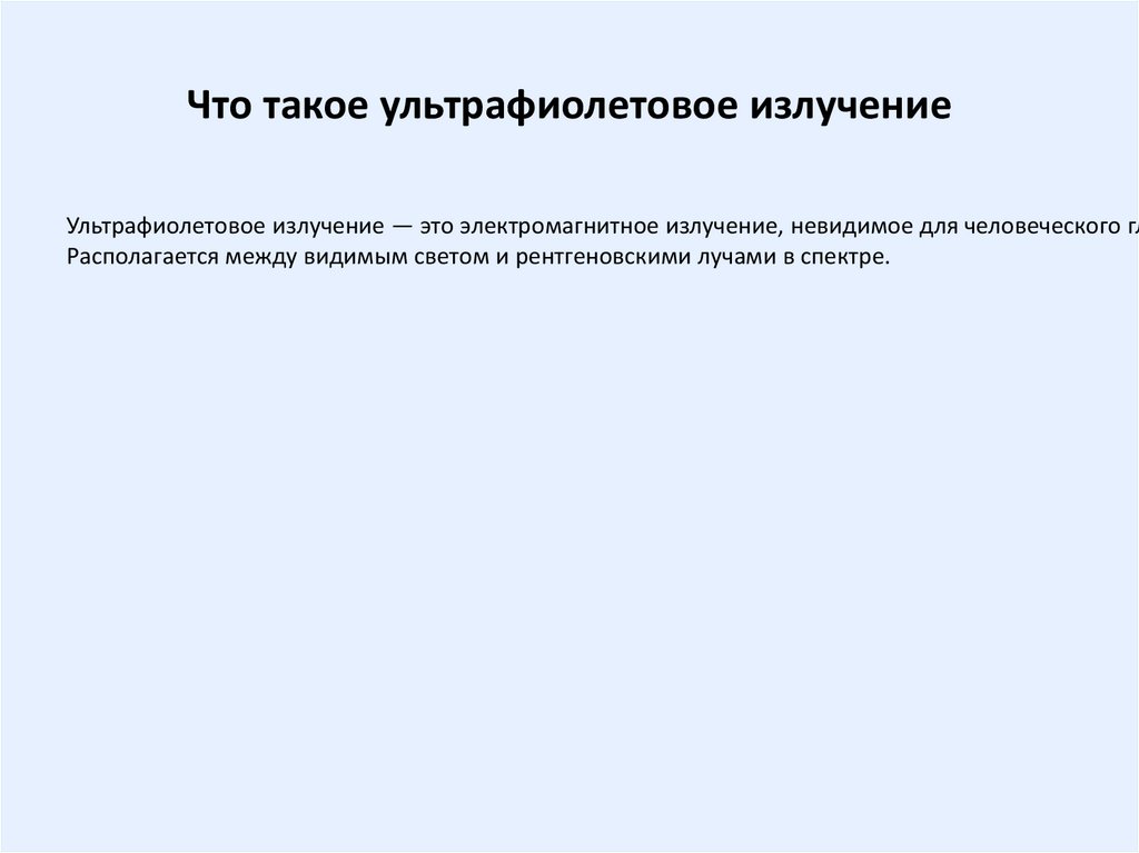 Что такое ультрафиолетовое излучениеУльтрафиолетовое излучение — это электромагнитное излучение, невидимое для человеческого гл