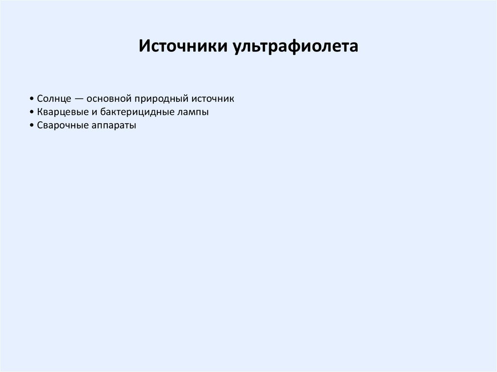 Источники ультрафиолета• Солнце — основной природный источник