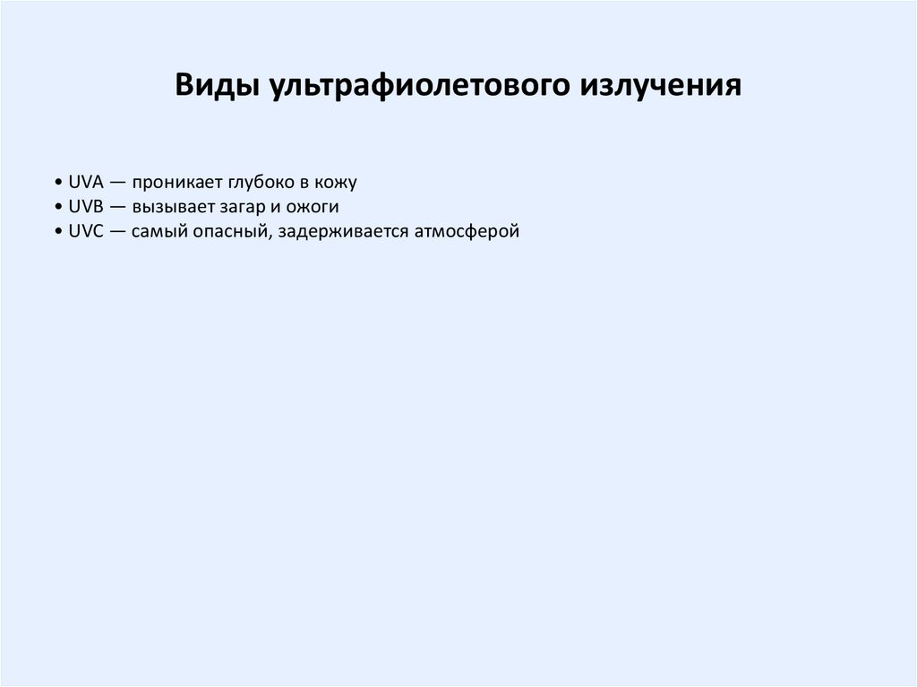 Виды ультрафиолетового излучения• UVA — проникает глубоко в кожу