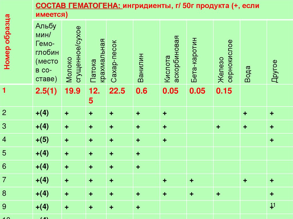 СОСТАВ ГЕМАТОГЕНА: ингридиенты, г/ 50г продукта (+, если