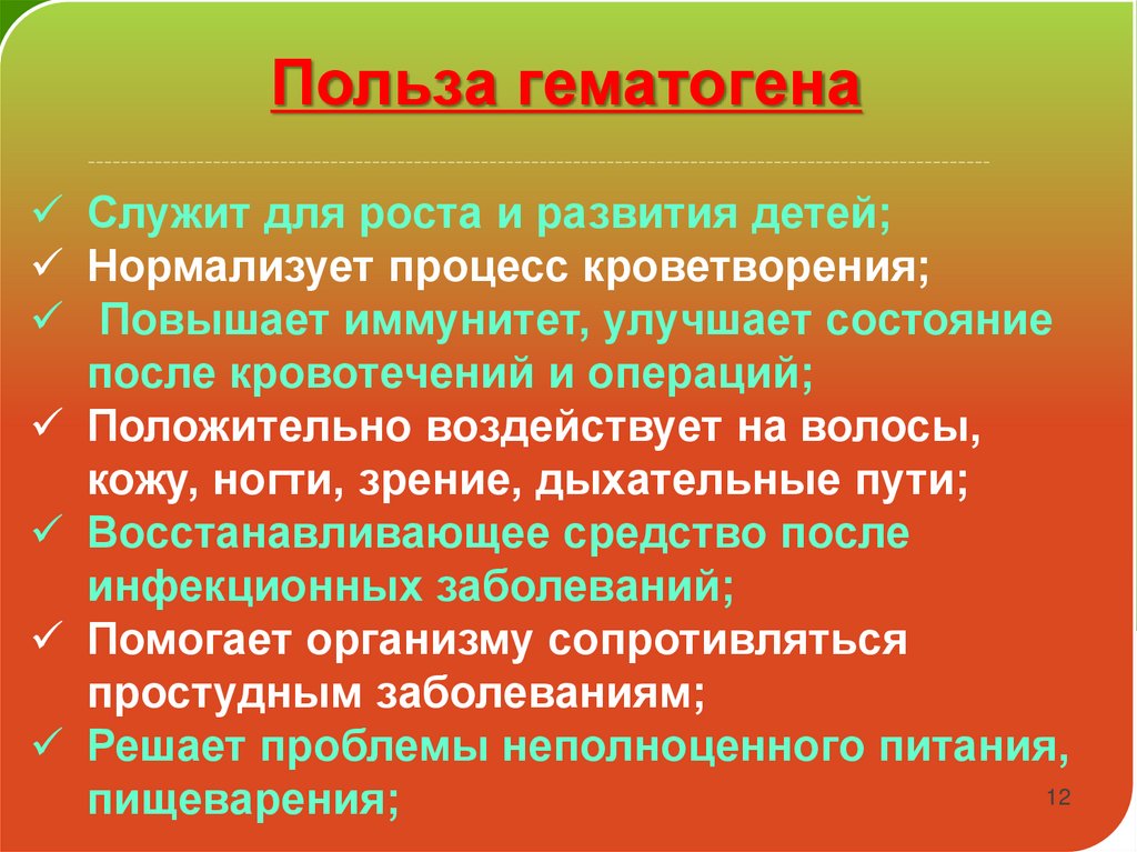 Польза гематогенаСлужит для роста и развития детей;
