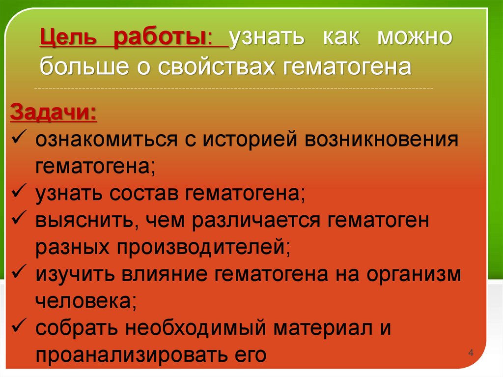 Цель работы: узнать как можнобольше о свойствах гематогена