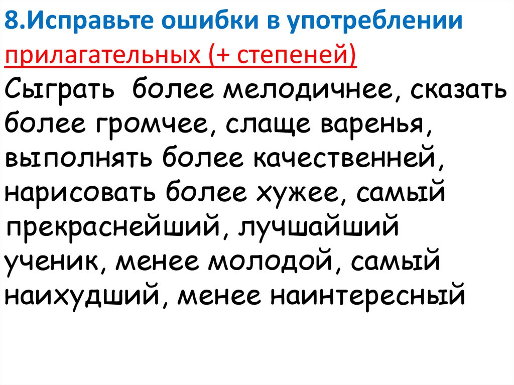 8.Исправьте ошибки в употребленииприлагательных (+ степеней)