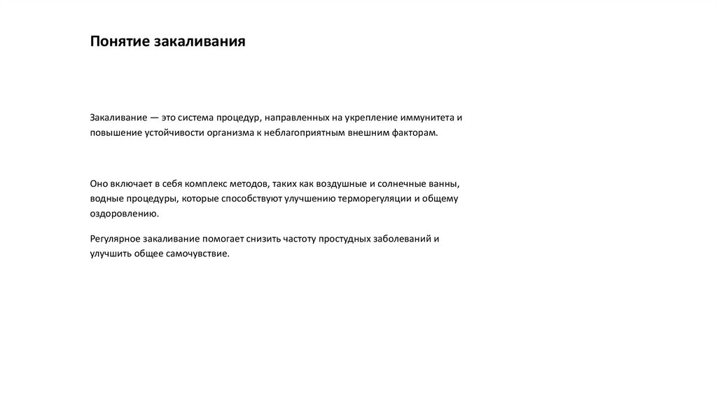 Понятие закаливанияЗакаливание — это система процедур, направленных на укрепление иммунитета и