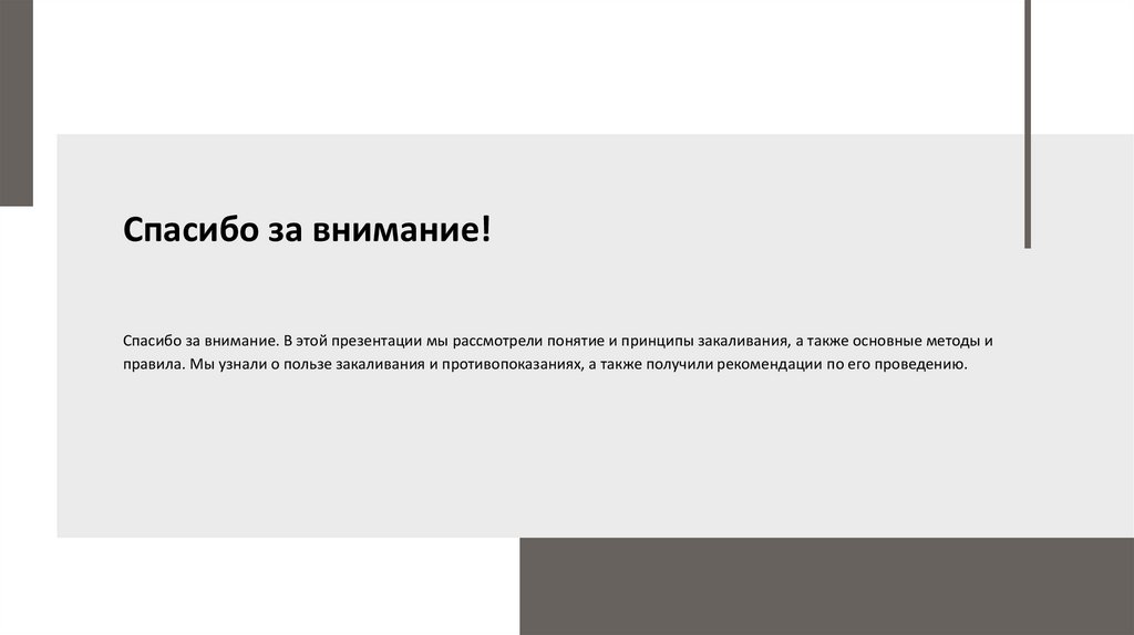 Спасибо за внимание!Спасибо за внимание. В этой презентации мы рассмотрели понятие и принципы закаливания, а также основные методы и