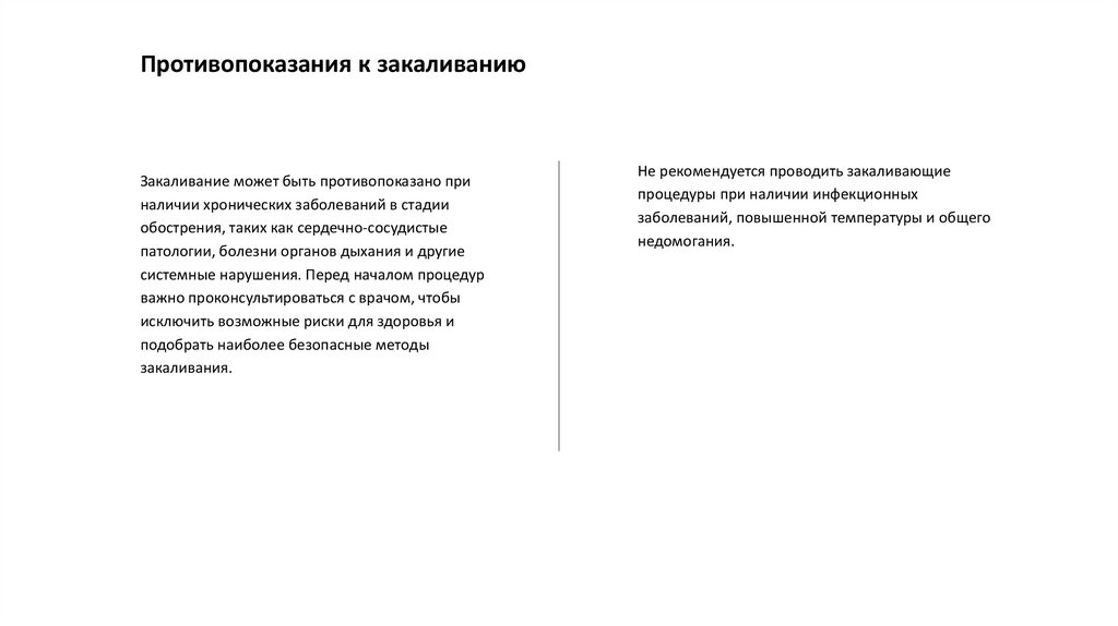 Противопоказания к закаливаниюЗакаливание может быть противопоказано при