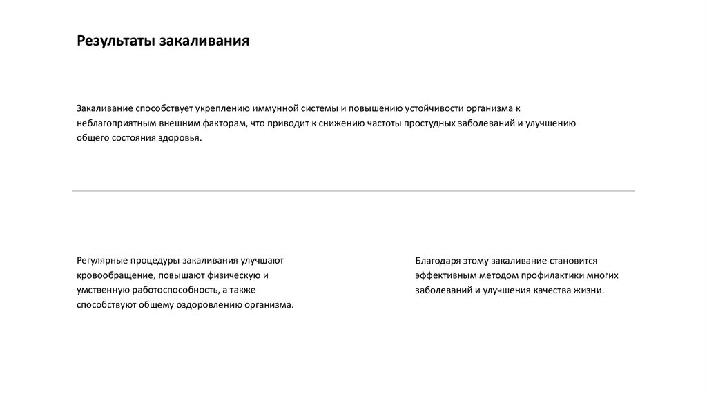 Результаты закаливанияЗакаливание способствует укреплению иммунной системы и повышению устойчивости организма к